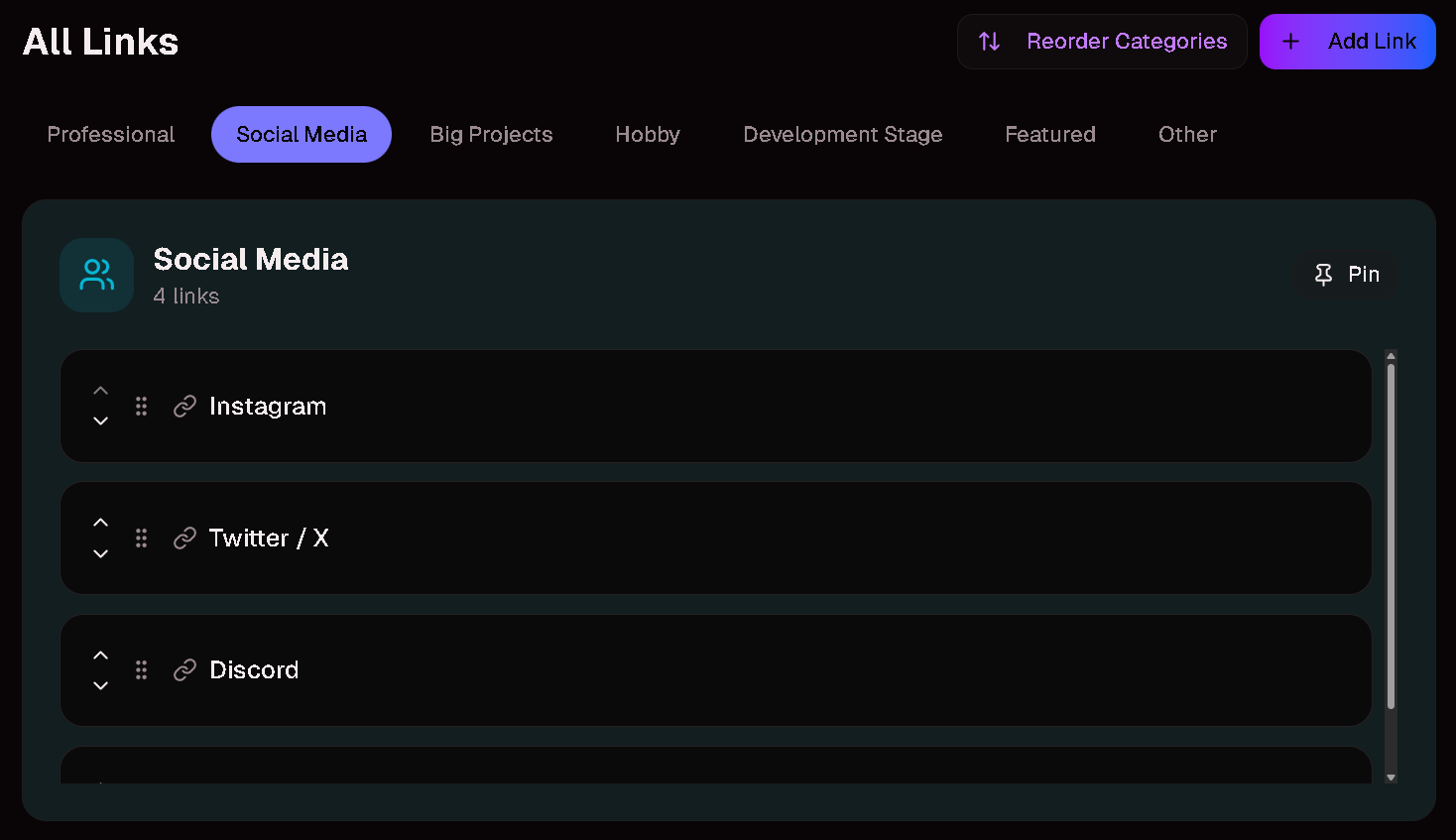 Categorize your links into Featured, Projects, Social Media, Hobbies, and more.